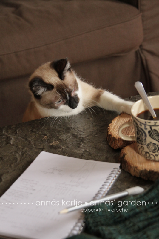 Szöszi persze mindig kiköveteli magának a figyelmemet, hol a fonalaimat lopkodja, hol a kötőtűimet rágcsálja, hol a ceruzáimat kergeti a kanapé alá, ki tudja, hány íróeszköz bújik meg a szekrények alatt, elérhetetlen helyeken... Jó hogy itt van velem ez a bolondos macska :)